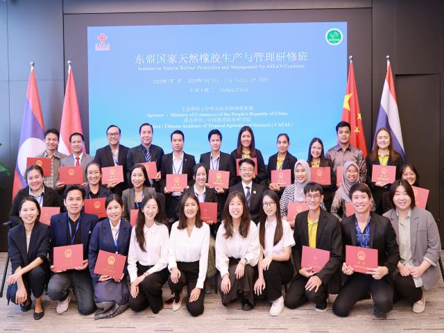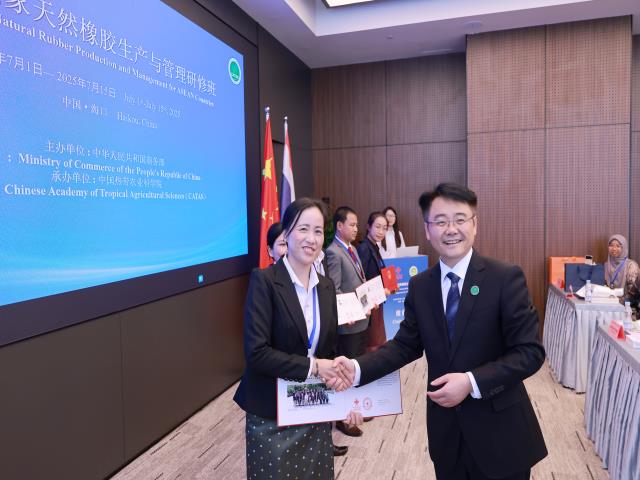 2025年7月15日,由商务部主办、中国热科院承办的“东盟国家天然橡胶生产与管理研修班”在海南海口圆满落幕。来自泰国、老挝、印度尼西亚3个东盟国家的橡胶领域专家和技术官员顺利完成培训。中国热科院副院长李积华出席结业仪式并为参训学员颁发结业证书。