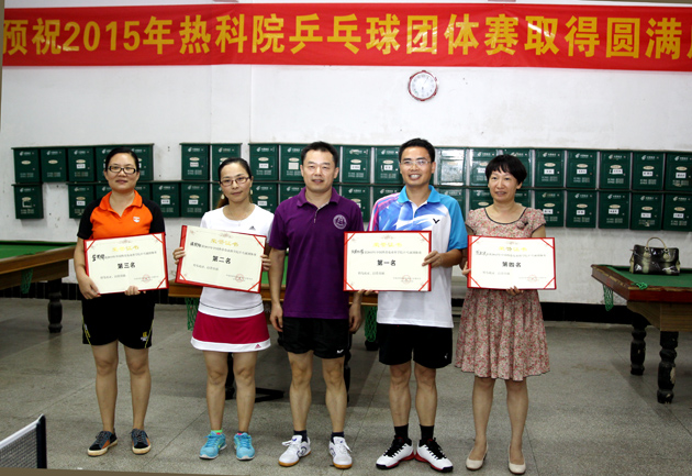 9月17日,由院工会组织的热科院2015年职工乒乓球混合团体赛在海口院区拉开帷幕。经过两天紧张激烈的角逐,附属中小学代表队最终摘得桂冠,橡胶所代表队获得亚军,生物所代表队、院机关代表队分别获得第三、第四名。汪学军副院长参加机关代表队比赛并为获奖单位颁奖。