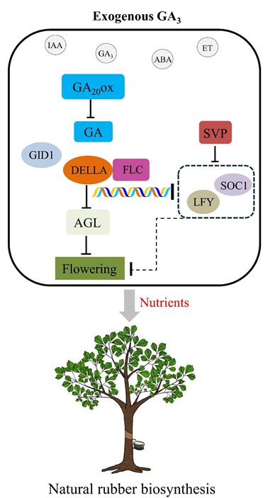 近日,中国热科院橡胶所排胶机理与调控课题组在赤霉素调控橡胶树开花研究方面取得重要进展,初步阐明外源赤霉素及其抑制剂通过减少橡胶树花期养分消耗促进天然橡胶生物合成的分子机制。