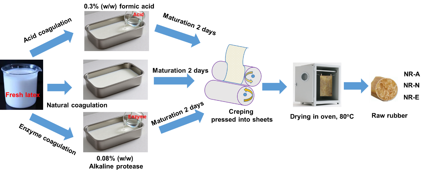图1 不同凝固工艺天然橡胶的制备过程;NR-A酸凝固天然橡胶:NR-N自然凝固天然橡胶;NR-E酶凝固天然橡胶