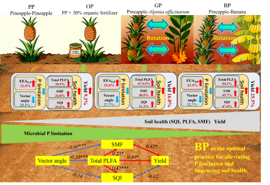 图1 轮作和有机肥施用缓解微生物磷限制提高土壤健康与菠萝产量
