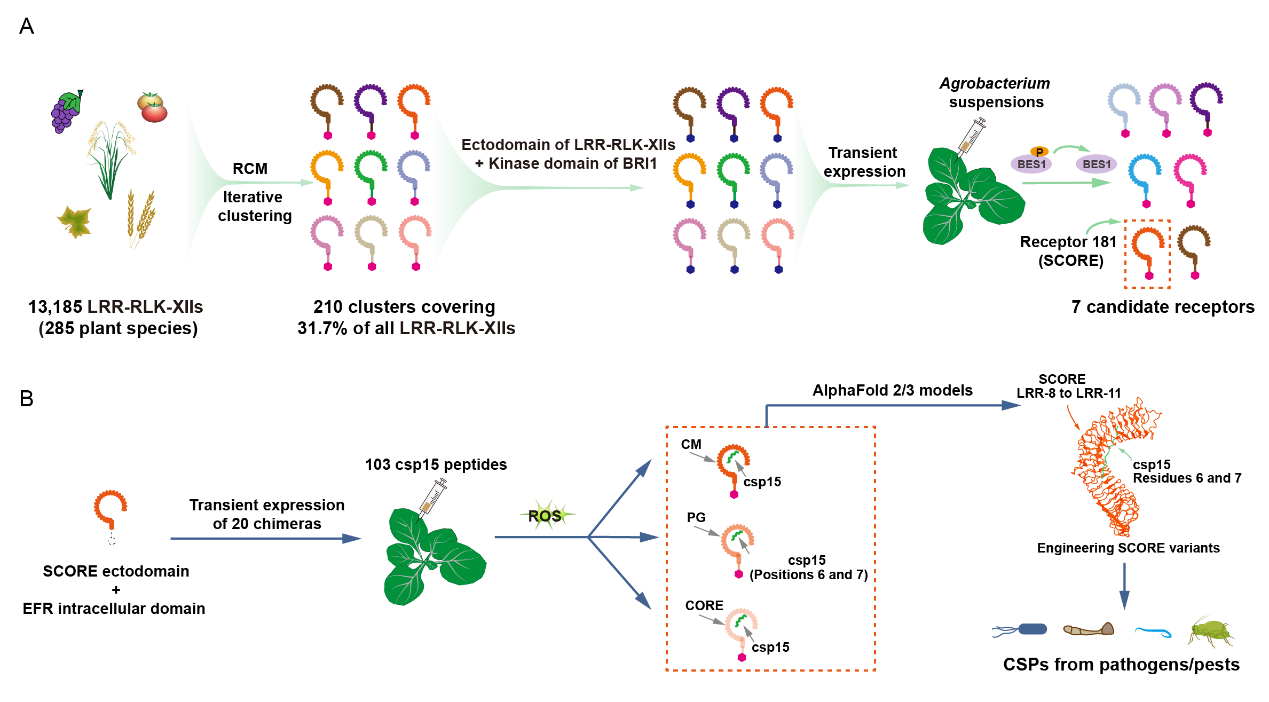 当病原体入侵时,植物细胞表面分布的模式识别受体(PRRs)蛋白质能精准识别其特有的分子标志,进而迅速激活第一道免疫防线PTI反应。受体激酶(RLKs)是PRR的一类,其中, LRR-RLKs的XII亚组(LRR-RLK-XIIs)专门负责识别PAMP,是植物免疫响应中的核心力量。迄今,在LRR-RLK-XII成员中,成功匹配的“受体—配体”组合不足十对。这主要受传统研究方法的效率限制,尤其在非模式植物中,分离与鉴定这类受体如同大海捞针。Ken Shirasu教授团队的研究实现了从“大海捞针”到“高效筛选”的跨越。团队采用“重复序列保守性映射(RCM)”技术将4177个代表性LRR-RLK-XII划分为210个集群,绘制出一幅免疫“哨兵”图谱。研究人员通过将候选受体的胞外识别域与已知的油菜素内酯受体激酶BRI1的胞内信号域融合,构建嵌合受体。通过监测关键信号分子BES1的去磷酸化反应,实现了对病原菌激活受体的快速筛选。