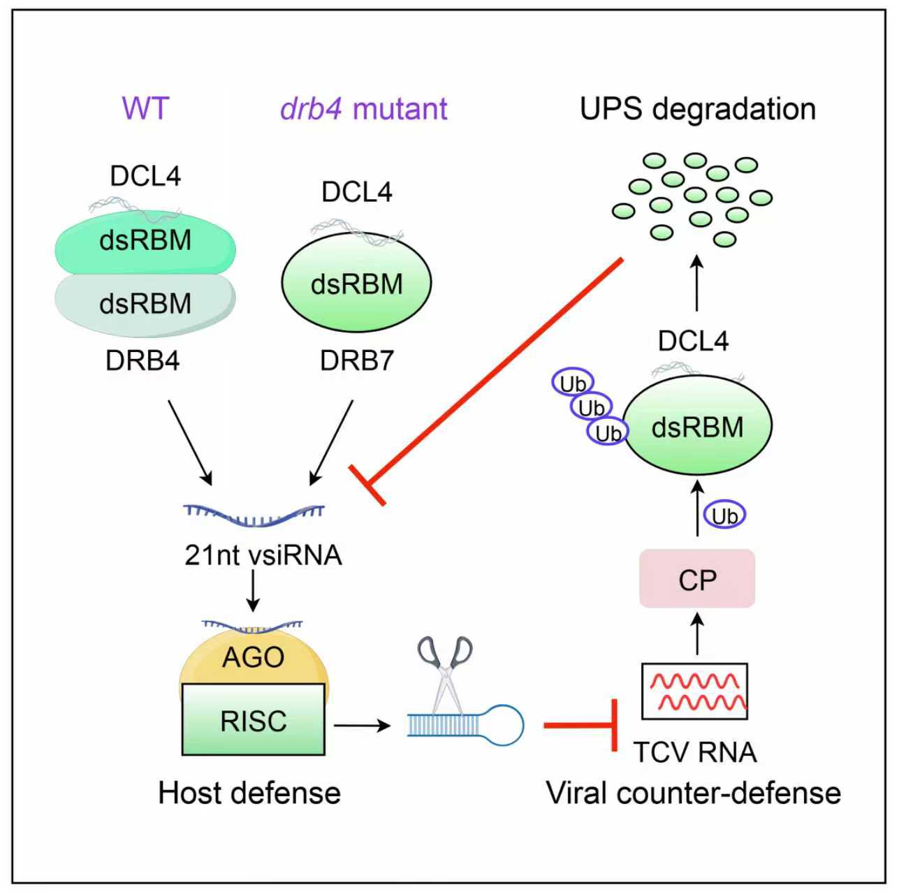 植物与病毒之间的进化军备竞赛驱动了宿主防御机制与病毒反防御策略的不断创新。RNA沉默作为植物中一种基础的抗病毒策略,主要由Dicer-like(DCL)蛋白介导,其中DCL4在产生21核苷酸病毒小干扰RNA(vsiRNA)中起关键作用,而其经典辅助因子DRB4能够稳定DCL4的活性。然而,在drb4突变体中仍存在残留的DCL4介导的抗病毒活性,暗示存在不依赖于DRB4的补偿机制。目前,这种补偿机制的分子基础尚不清楚。与此同时,病毒已进化出复杂的反防御策略,常通过劫持宿主蛋白稳态网络(如泛素-蛋白酶体系统)来降解RNA沉默通路的关键组分。
