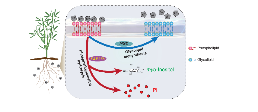 该研究通过根系表型分析,整合多组学(Iso-seq、RNA-seq、代谢组、脂质组)技术,在柱花草根系中鉴定到一个受酸铝诱导的PAP家族基因SgPAP27b。随后,通过生化酶学性质表征及转基因功能验证,阐明了SgPAP27b能直接催化磷脂酰肌醇水解,促进肌醇积累,从而通过调控膜脂重塑增强植物的耐酸铝能力。PAP家族基因此前已知的主要功能是帮助植物适应低磷胁迫,而本研究鉴定的SgPAP27b是首个被证实具有耐酸铝功能的植物PAP基因。