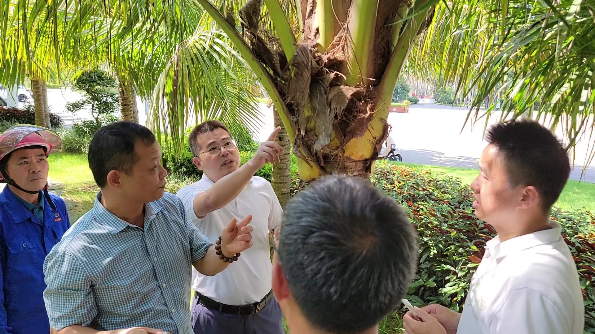 6月6日上午,应后勤服务中心邀请,椰子所覃伟权研究员、李朝绪副研究员一行到海口院区开展棕榈植物病虫害调查及椰子椰心叶甲生物防治技术指导。后勤服务中心主任陈志权、副主任余树华等相关人员到现场参加防治技术学习。