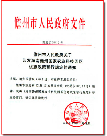 儋州市人民政府关于印发海南儋州国家农业科技园区优惠政策暂行规定的通知