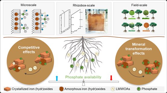 磷肥的高投入和低效利用损害生态系统健康、威胁未来全球粮食安全,提高土壤磷的有效性、闭合磷循环日益成为环境和地球化学等领域研究重点和前沿。磷酸盐在土壤中的滞留和迁移与铁氧化物的吸附和根系分泌的LMWOAs密切相关。本研究在培养和田间条件下研究了LMWOAs对磷酸盐的活化机制。LMWOAs的竞争效应通过降低铁氧化物对磷酸盐的吸附能力(下降约74%)来提高磷酸盐的有效性。然而,在矿物转化过程中,LMWOAs的存在改变了铁氧化物的晶相、结晶度、颗粒形态、比表面积和表面反应性,导致磷酸盐吸附能力增加了近6倍。微域根系模拟实验证实,根系分泌物LMWOAs显著改变了不同可提取磷酸盐种类和铁组分的含量,其中反应性较强的无定形铁含量显著增加,进一步导致有效磷含量下降10%~30%。此外,田间研究表明,芒果树行间作物覆盖可显著提高根际土壤中芒果根分泌物LMWOAs的含量,使根际土壤有效磷含量增加34.33%~147.33%。以上结果表明,在根系分泌LMWOA存在的情况下,铁氧化物表面的磷酸盐保留和磷酸盐释放之间存在微妙的平衡(图1)。